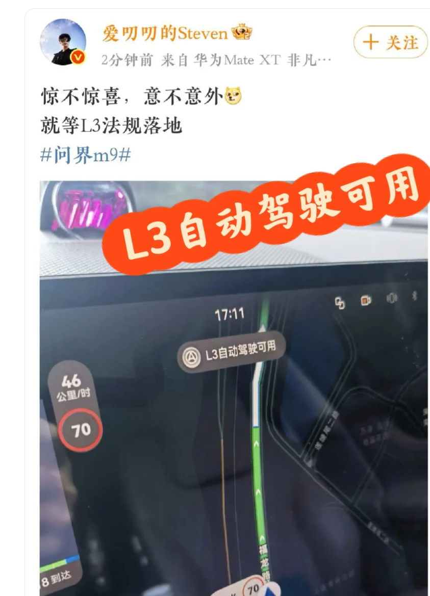 “仪表盘弹出‘L3自动驾驶可用’的瞬间,感觉像提前摸到了未来!”2025年,华为智驾L3在问界M9等车型上开启测试的消息,迅速在车友圈引发热议——从网友晒出的实测截图来看,车辆在福龙路以46km/h时速平稳行驶,系统实时显示路况与距离,只需等待L3法规正式落地即可解锁全功能。与此同时,长安、比亚迪、宝马等车企也纷纷拿到L3测试牌照,一场关于“高阶智驾谁先落地”的竞赛已然打响。但欢呼背后,“事故谁担责”“功能边界在哪”“法规何时明确”等问题,仍让这场“L3狂欢”藏着不少待解的悬念。