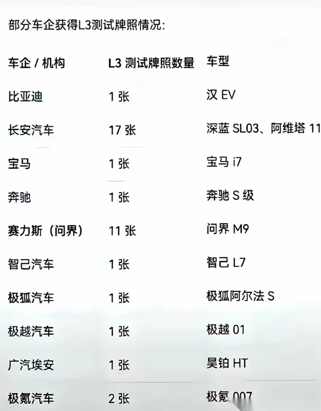 先看当下的“L3测试版图”:从已曝光的测试牌照分布来看,不同车企的进度差异明显。长安汽车以17张牌照领跑,覆盖深蓝SL03、阿维塔11等车型,成为目前布局最广的车企;赛力斯(问界)紧随其后,手握11张牌照,问界M9、M8及享界S9(t)、智界R7 ultra被传为首批搭载车型,华为智驾的技术加持让其备受期待;而比亚迪、宝马、奔驰等则各持1张牌照,分别以汉EV、i7、S级为测试载体,谨慎推进。这种“头部车企抢先试,others稳步跟”的格局,既体现了L3技术的高门槛,也暗示了行业对“先落地即占先机”的共识。