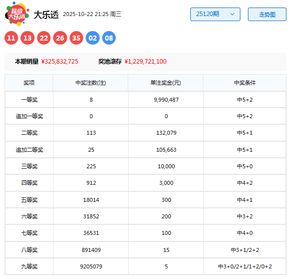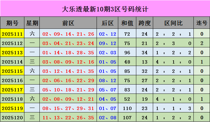 大乐透第25120期开奖。当期开奖号码为:前区11 13 22 26 35,后区02 08。当期前区号码大小比为3:2,奇偶比为3:2,三区比1:2:2;后区开出小大组合02 08
